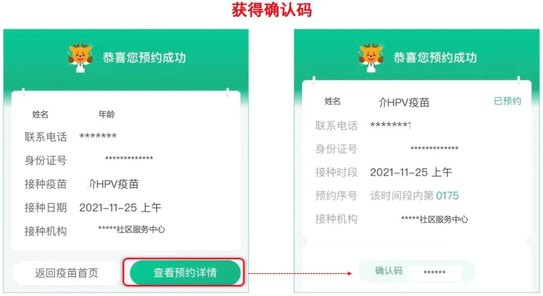 预约成功后,点击“查看预约详情”,获得确认码,之后请携带相关证件,按预约时间准时前往接种点接种。