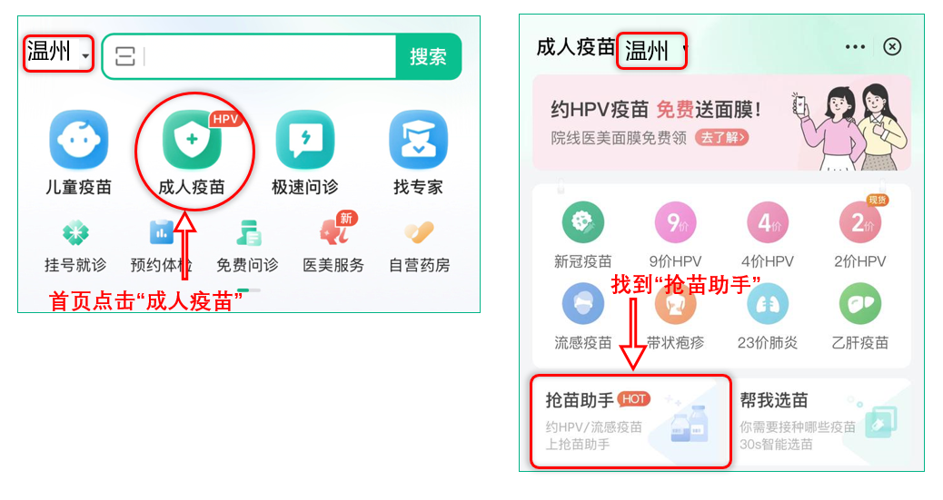 2、选择“温州”地区,点击首页“成人疫苗” ,进入页面后再点击“抢苗助手”