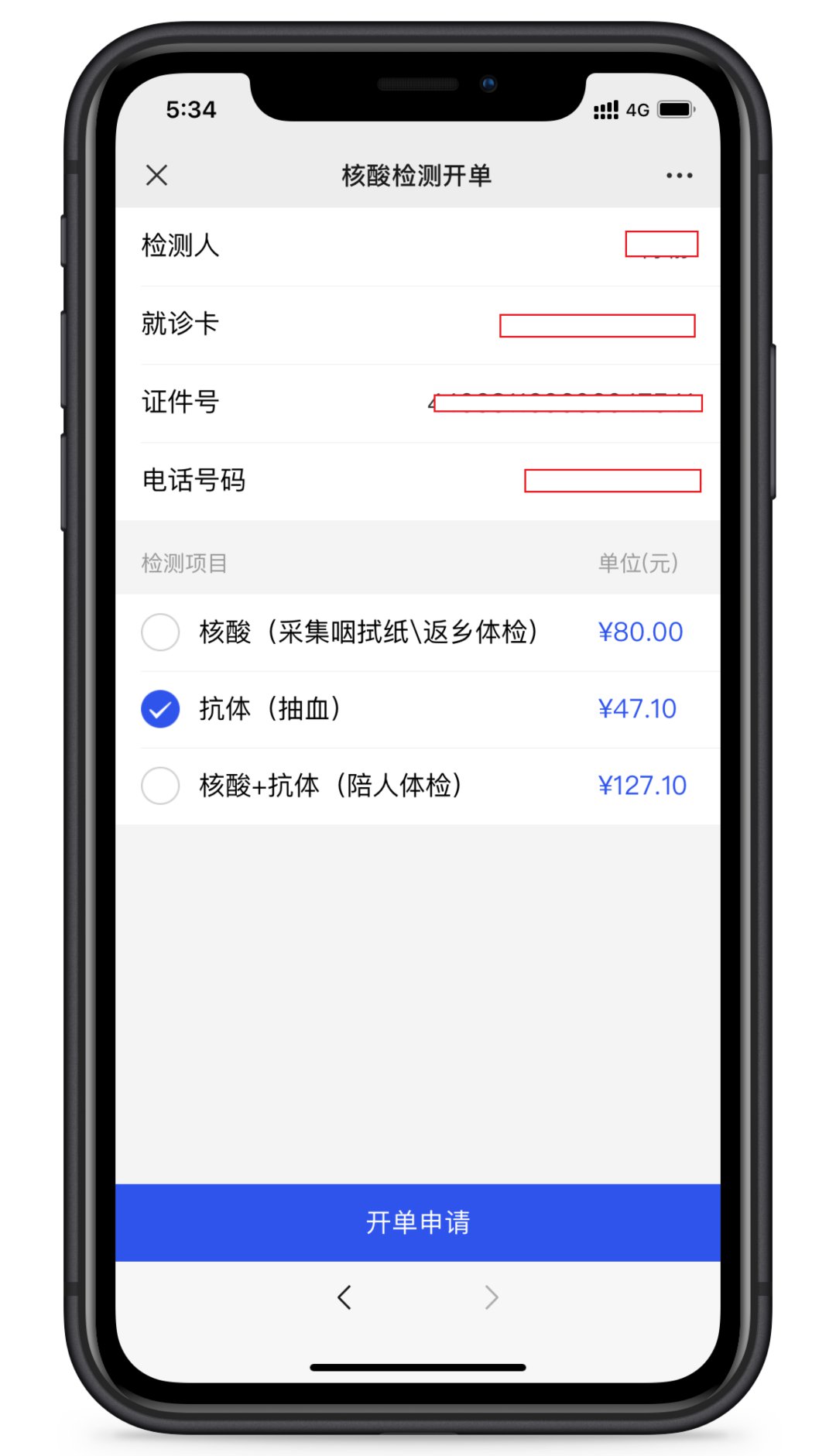 选择对应就诊人后,进入核酸检测开单界面,选择对应检查项目,点击“开单申请”,并点击“确认”。