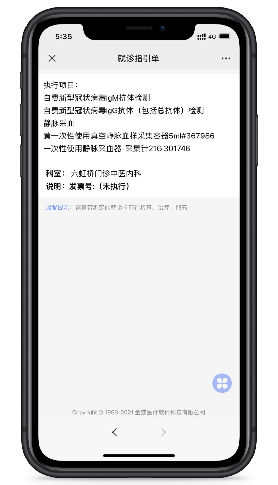 4、最后进行缴费,如需抗体检测,请去三楼化验室抽血后拿核酸条形码后去验核酸;如只需核酸检测,请去三楼化验室向工作人员获取核酸条形码后去验核酸。