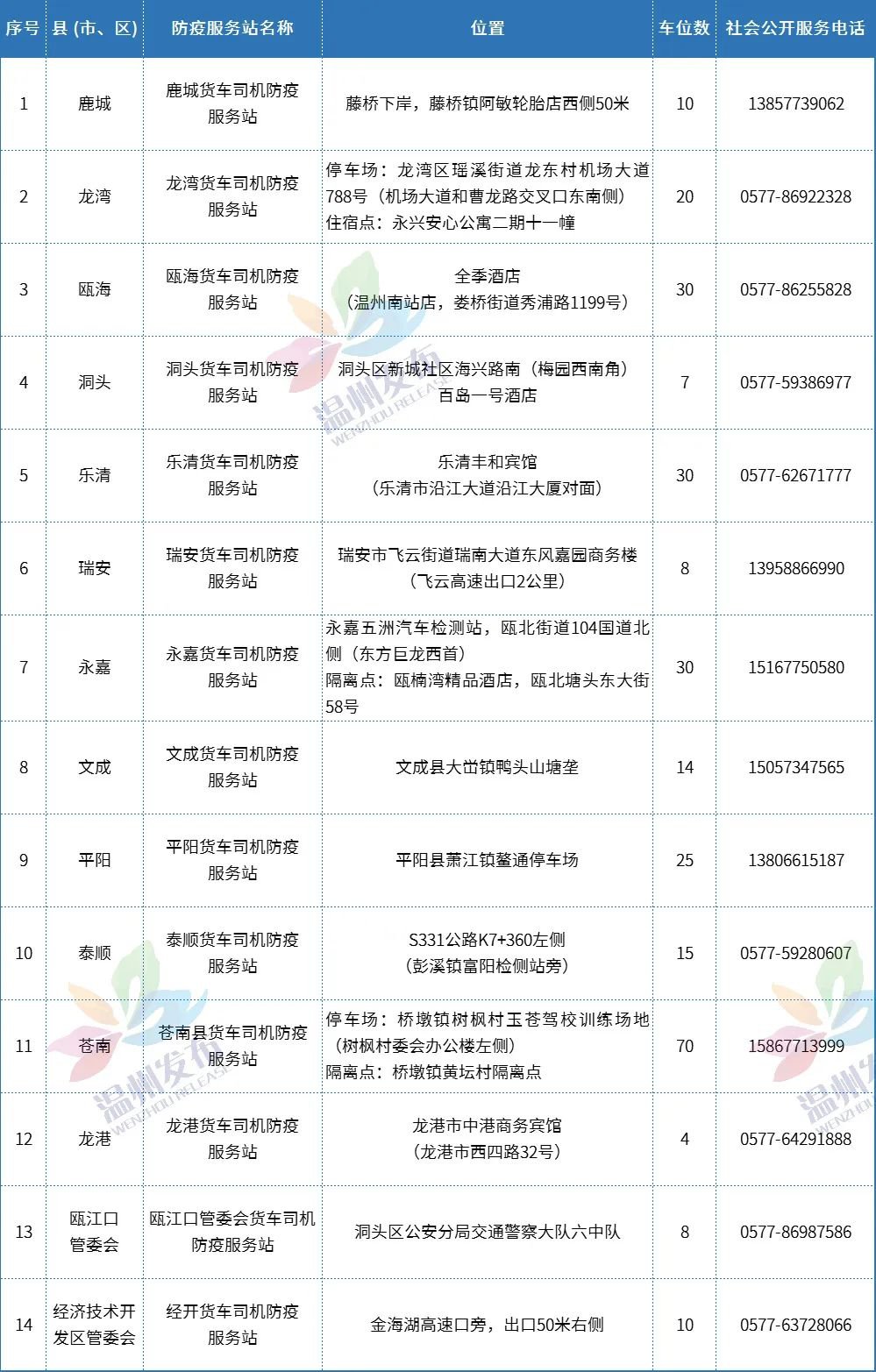 为切实做好对货车司机的疫情防控和管理服务,温州市各县(市、区)共设立了14个货车司机防疫服务站,为执行往返上海等中高风险地区、承担重点物资运输保障任务的货车司机提供住宿、餐饮、停车、抗原和核酸检测、车辆消杀等服务。