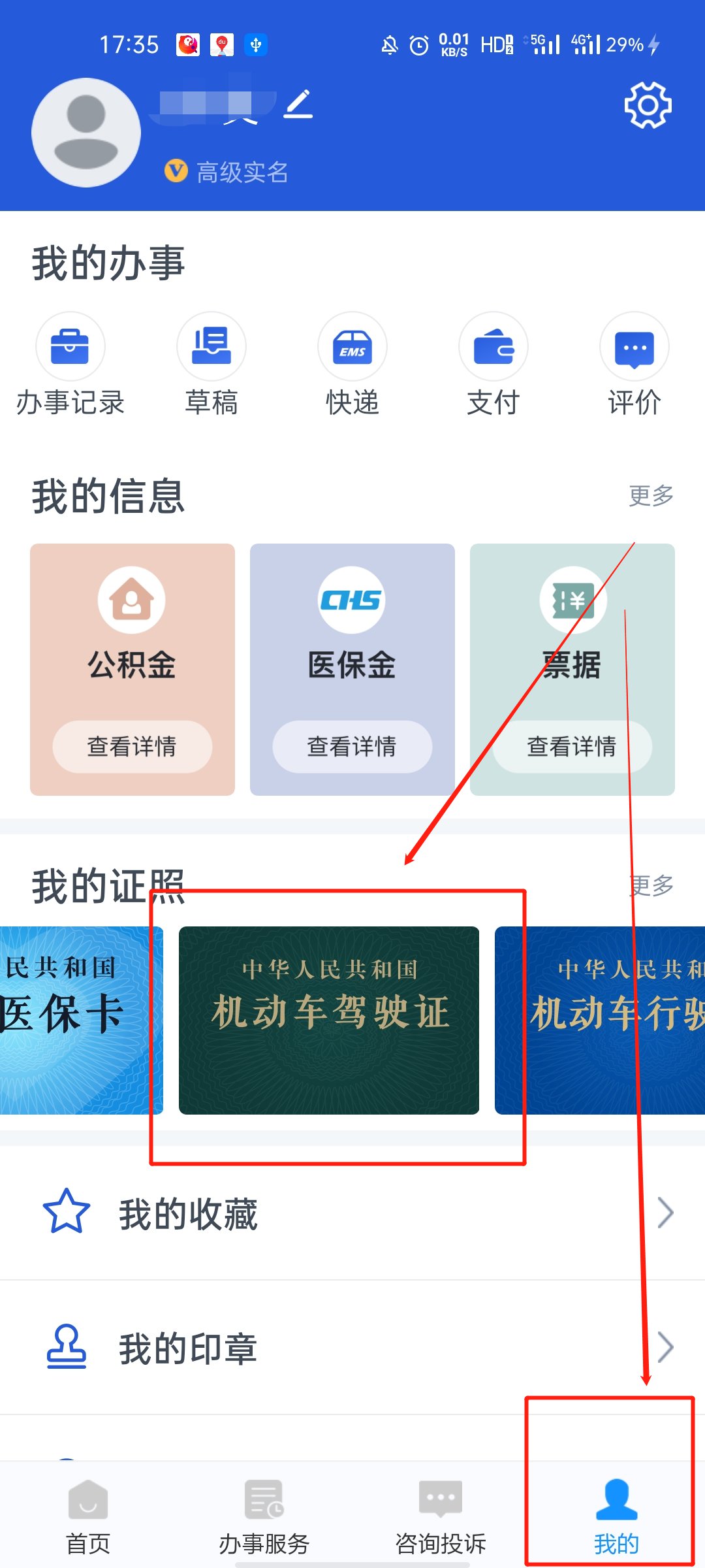 第三步,接着点击页面右下角菜单栏的“我的”,然后在“我的证件”栏下,像左滑动,找到并点击“机动车驾驶证”;
