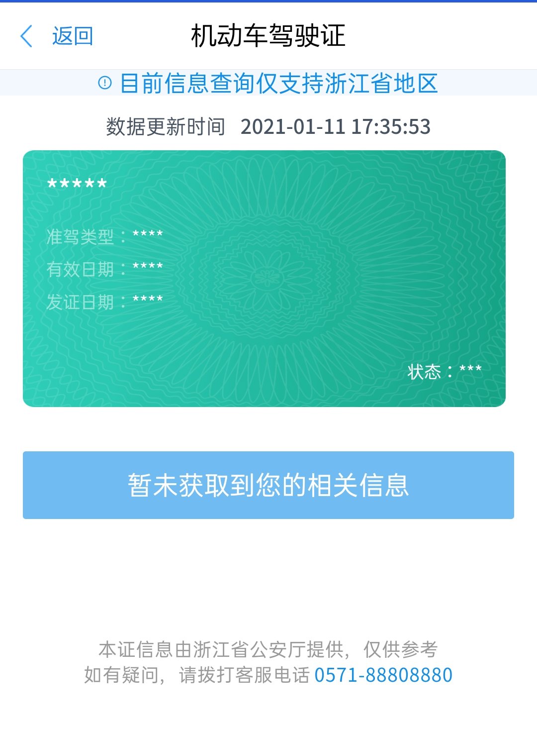 第四步,接着进行人脸识别,识别成功后即可获取电子驾驶证;(注:由于驾驶证未在浙江申领所以无法查询到相关信息。)