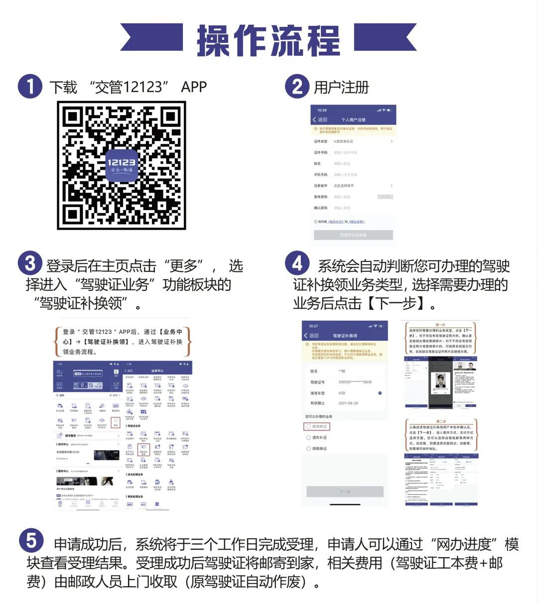 驾驶员在医疗机构体检后,可以通过交管12123申请换证,证件邮寄到家。