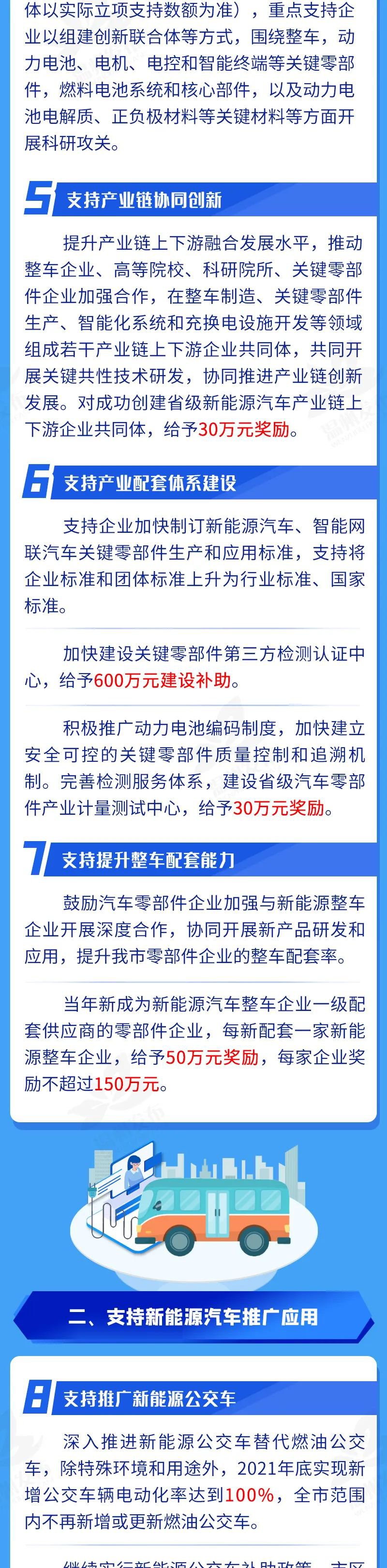 3.协同配套稳链。计划举办中国(温州)国际汽摩配博览会和新能源汽车的整零对接会,推动新能源汽车产业链上下游企业的技术交流和供应链合作。计划筛选一批关键零部件企业,引导企业按照整车配套标准进行改造提升,与整车企业开展深度合作,提升我市零部件企业的整车配套率。对新成为新能源汽车整车企业一级配套供应商的零部件企业,将给予50-150万元奖励。