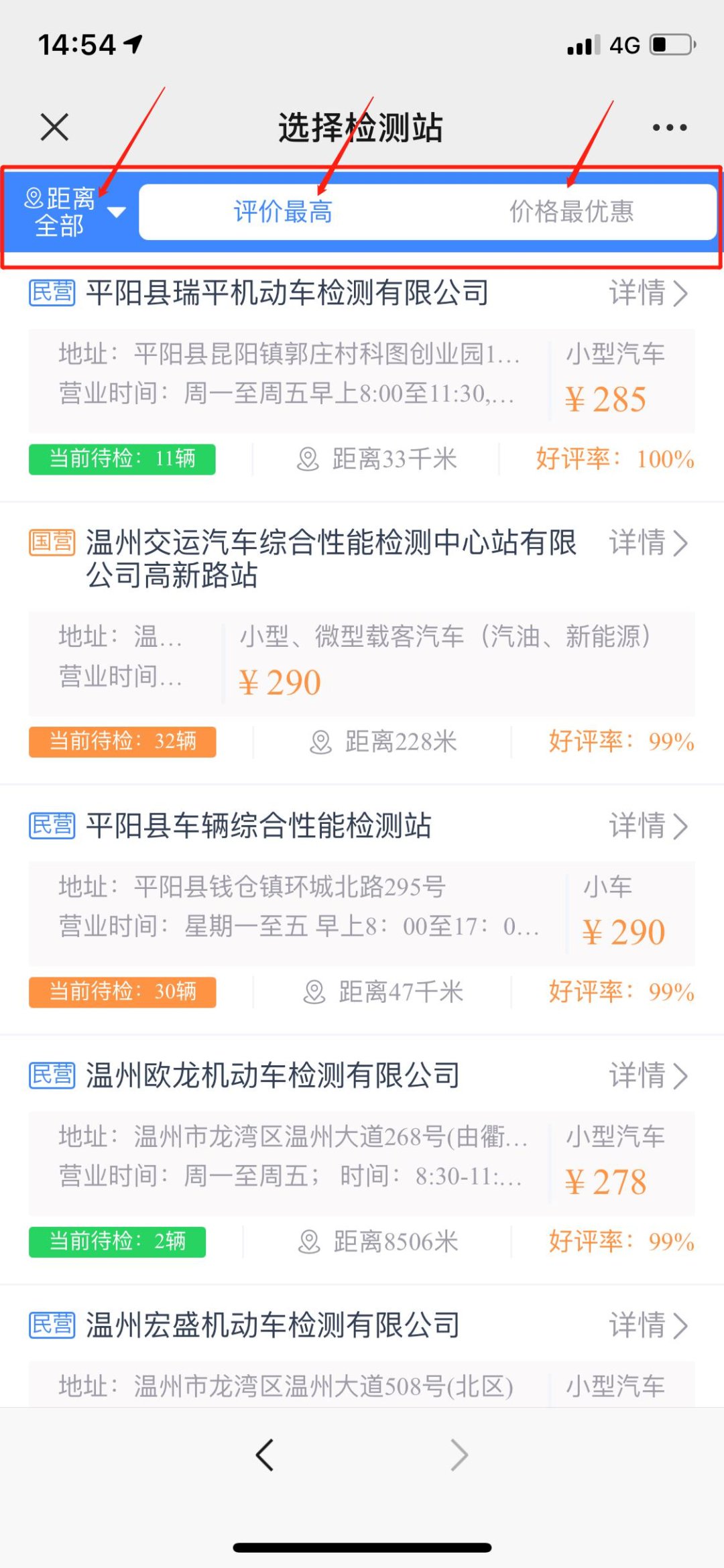 第四步:可以按距离、评价、价格进行排序,选择中意检测站。