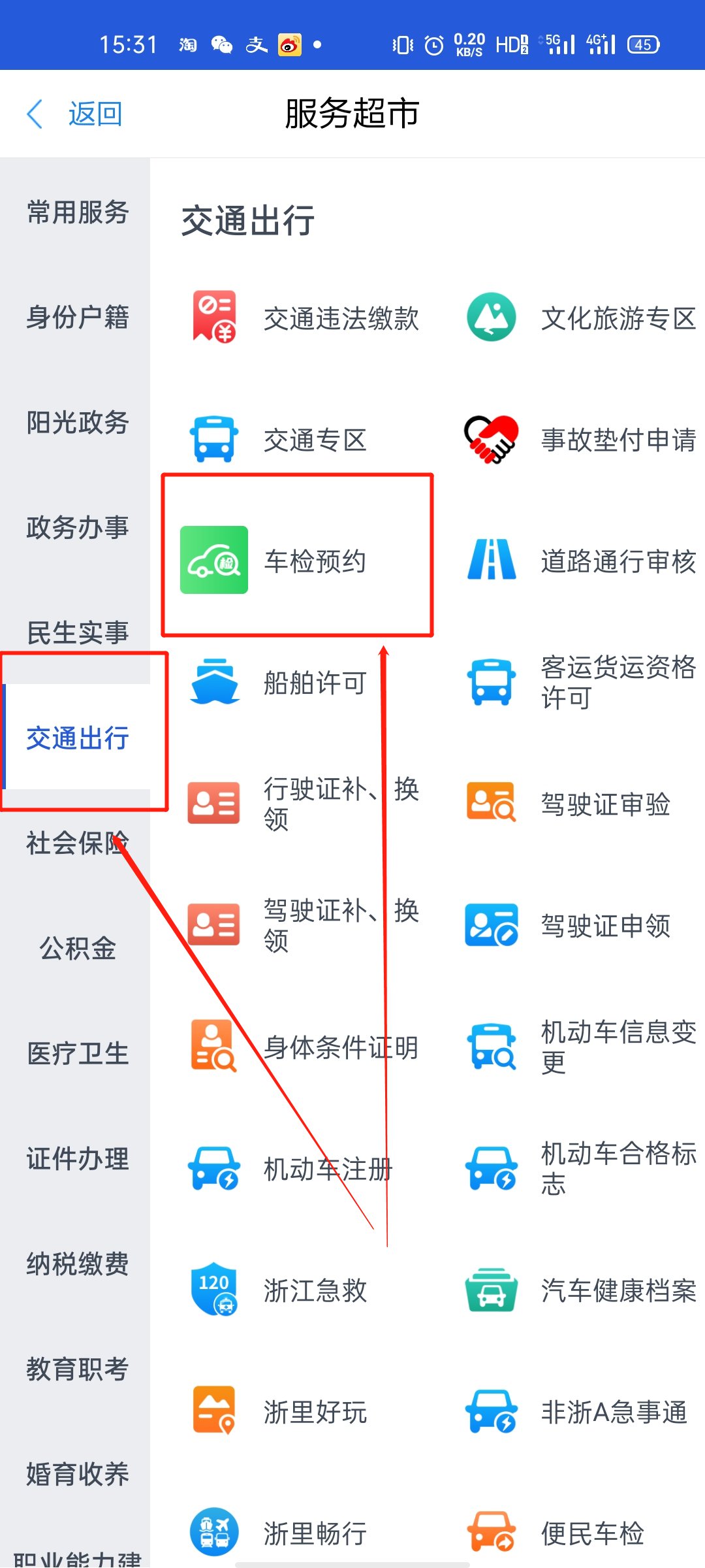 第三步,在页面左侧的“交通出行”服务栏下选择“车检预约”;(如下图所示)