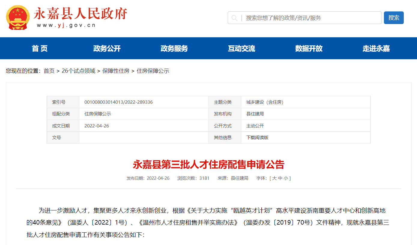 2022年温州永嘉县第三批人才住房配售申请时间及入口