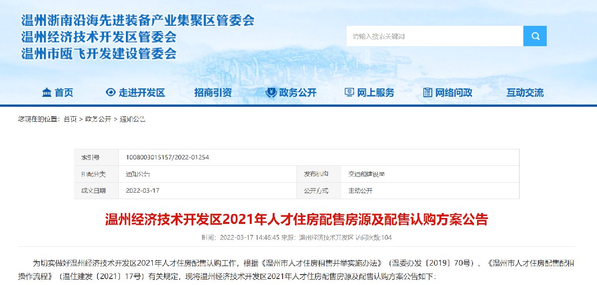 温州经济技术开发区2021年人才住房配售房源及配售认购方案公告