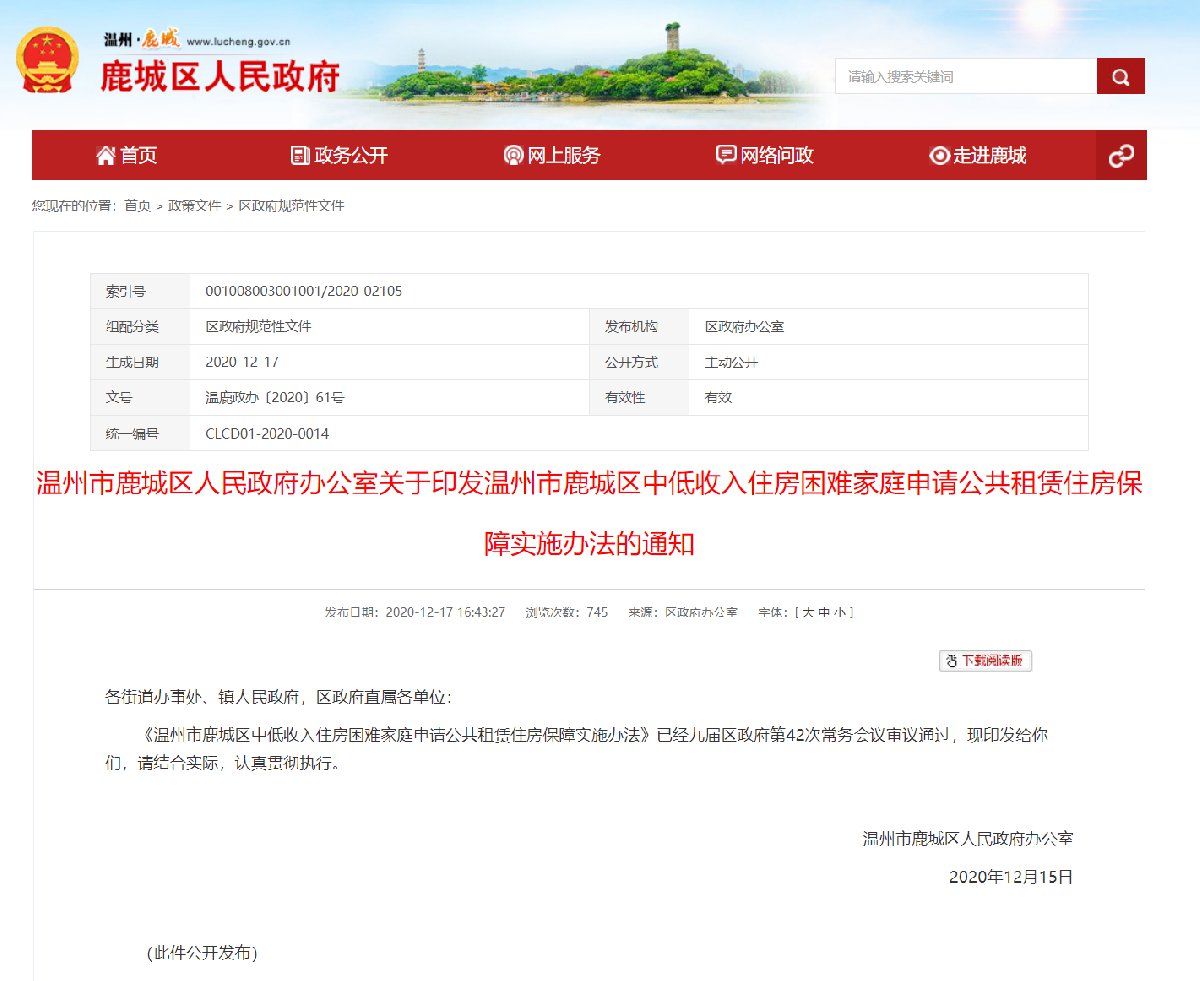温州鹿城中低收入住房困难家庭申请公共租赁住房保障实施办法