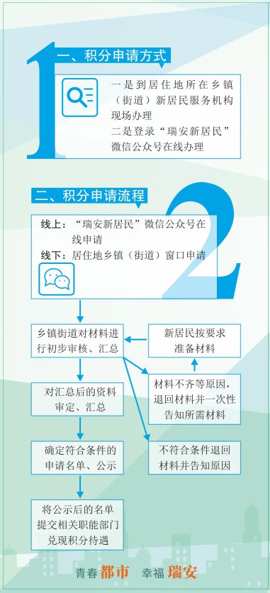 1、今年的积分申请可至居住地所在乡镇(街道)新居民服务机构现场办理;同时新增线上办理方式,新居民可登录“瑞安新居民”微信公众号直接进行网上申请。