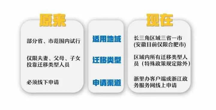 从原来必须线下窗口申请,升级为长三角区域内户籍人员迁入浙江的申请人,可以通过浙里办客户端或浙江政务服务网线上申请。