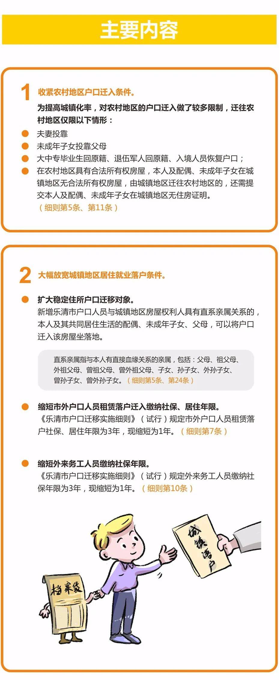 新政策中,收紧农村地区户口迁入条件;大幅放宽城镇地区居住就业落户条件;大幅扩大城镇地区投靠类户口迁移对象;扩大人才类人员在乐清市的先落户后择业的范围;新增取得人才公寓居住权的人才和酒店式公寓产权人可办理落户;扩大了单位集体户落户对象。