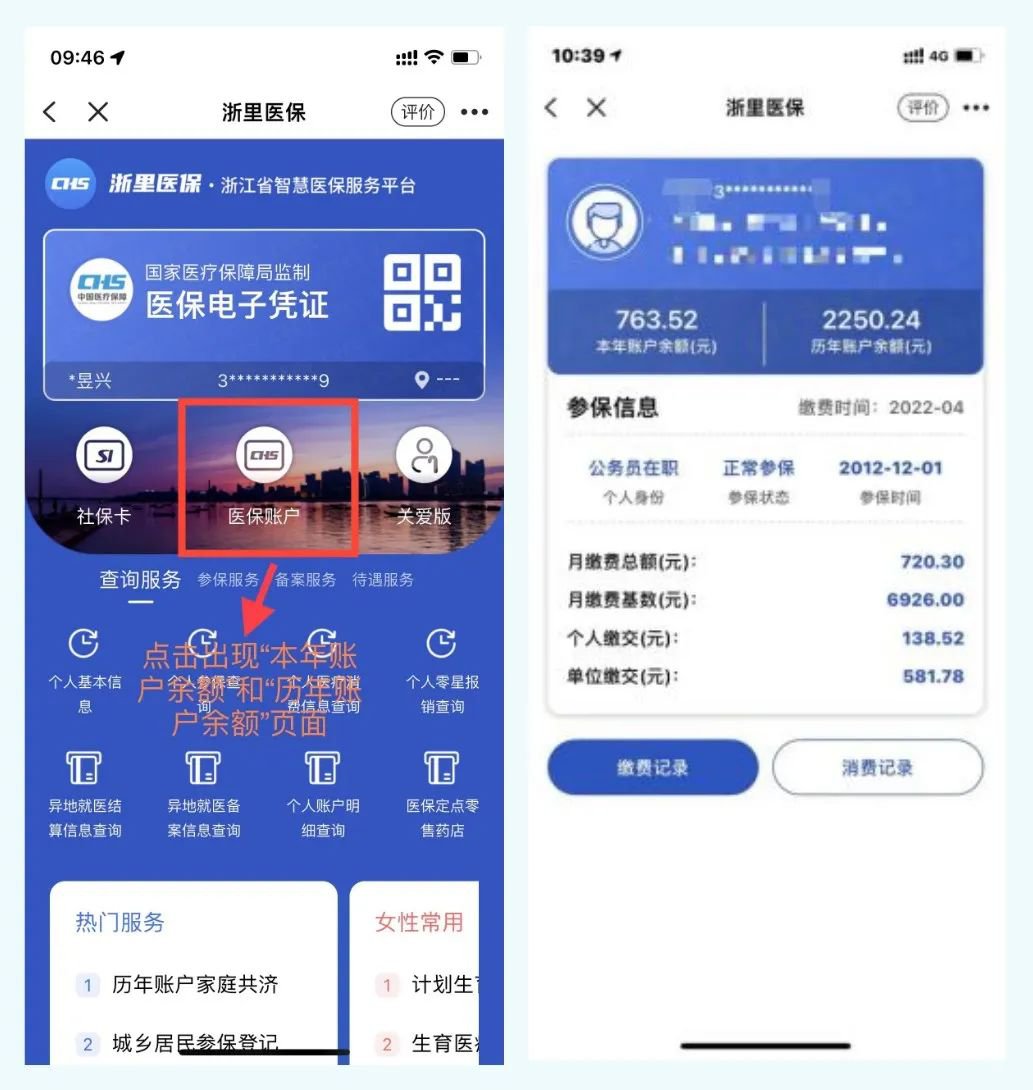 在“浙里医保”首页点击“医保账户”即可查询个人账户余额、参保状态、月缴费基数、月缴费金额等信息。