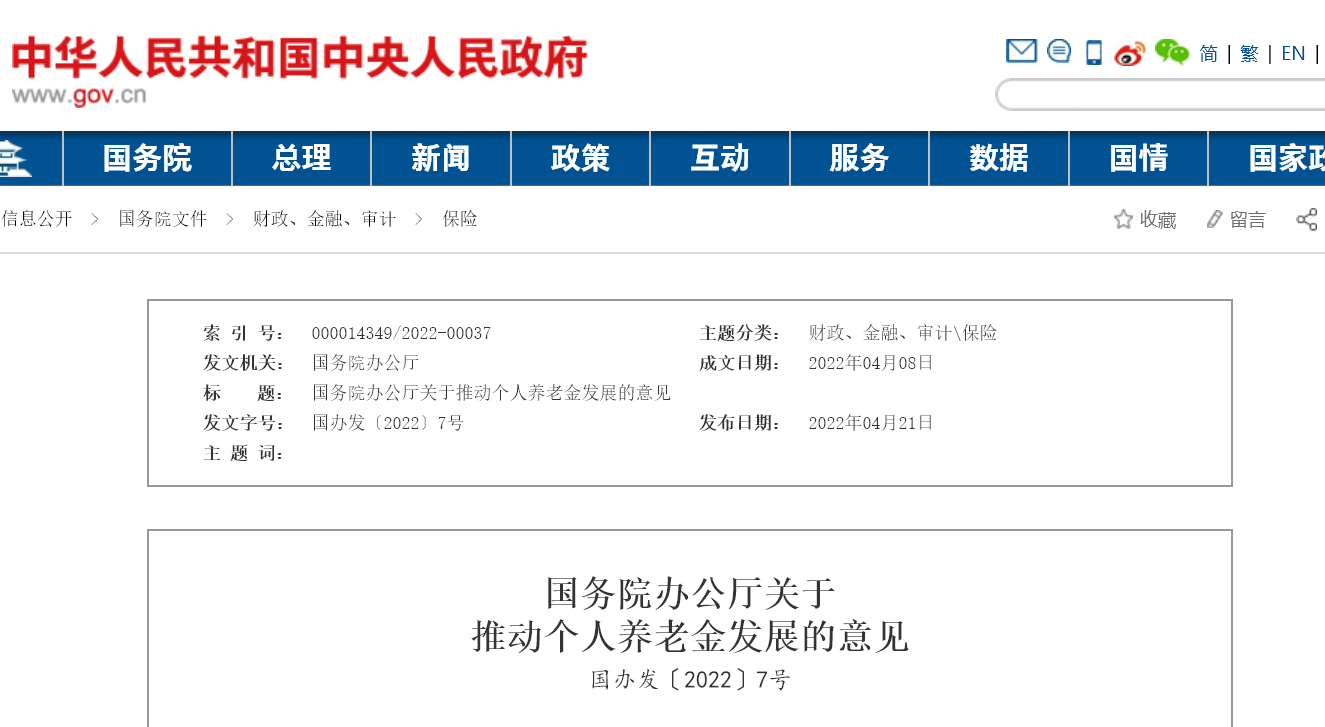 4月21日,《国务院办公厅关于推动个人养老金发展的意见》,明确了个人养老金的参加范围、制度模式、缴费水平、投资和领取等事项。