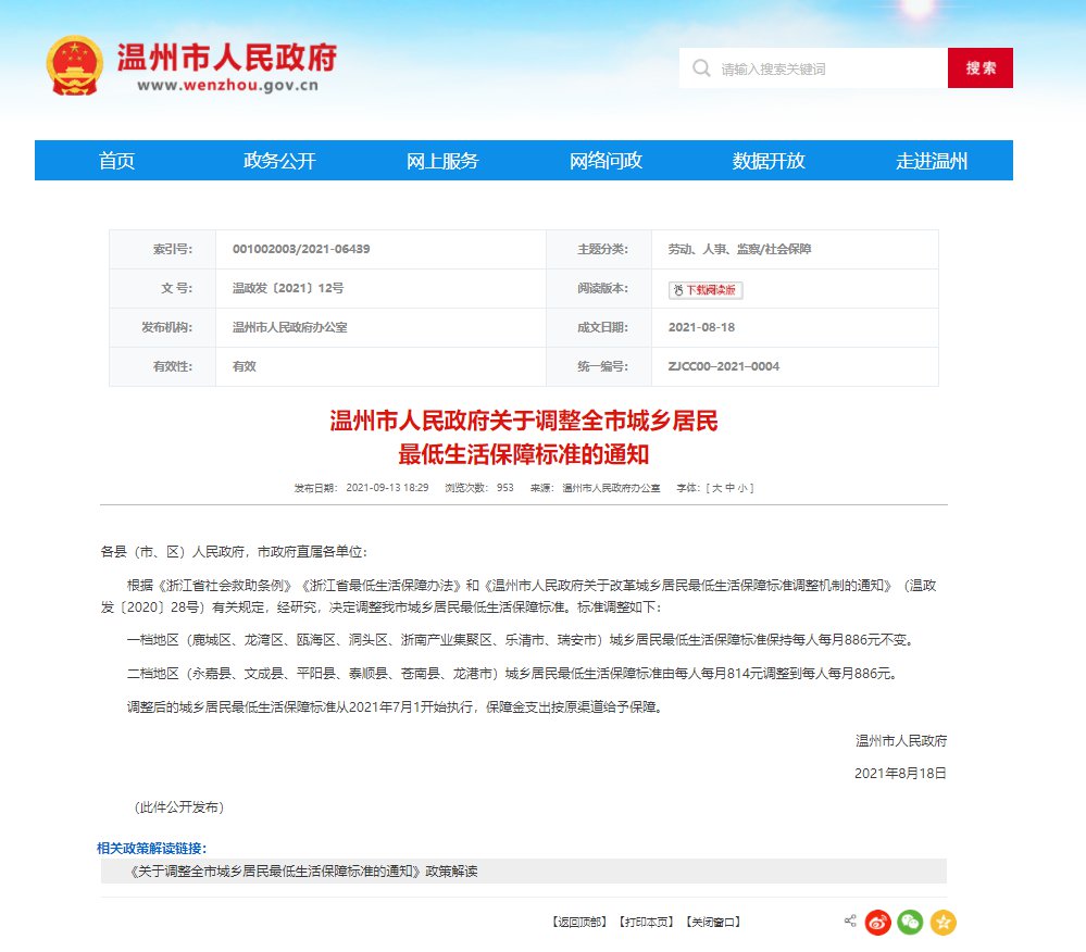 2022温州市最低生活保障标准是多少(温州最低生活费规定2020)