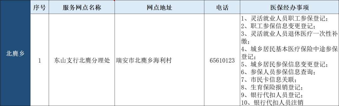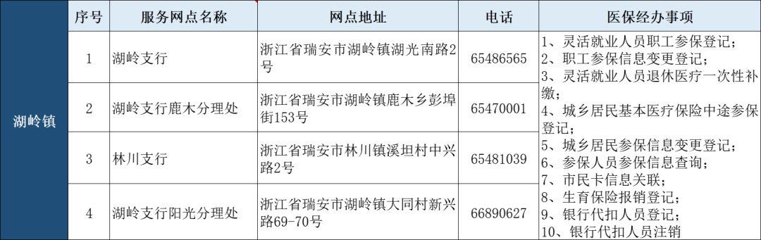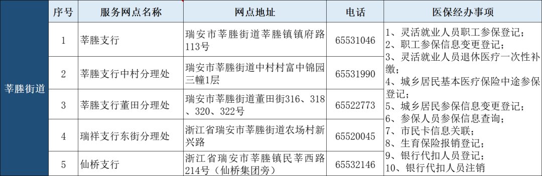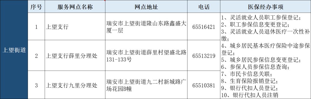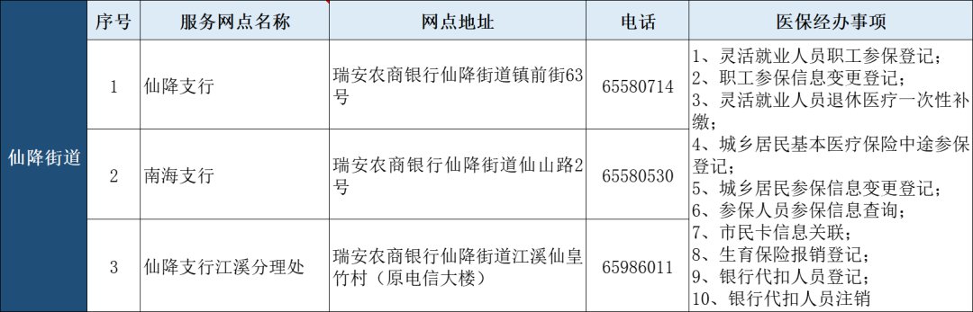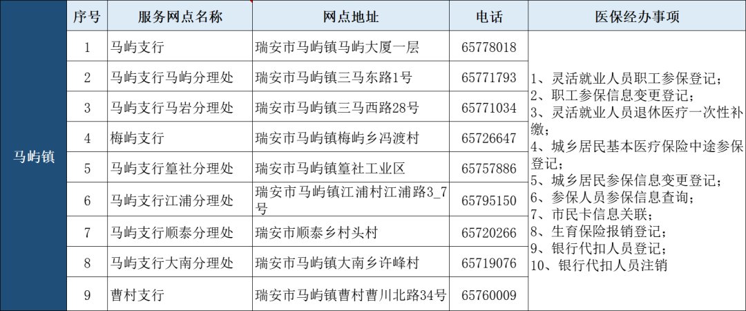 瑞安市“医保业务经办”银行代办点