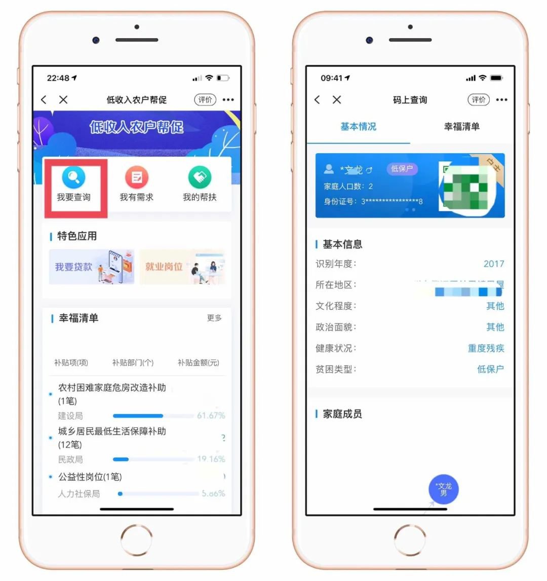 可查看基本情况和幸福清单,包含个人基本信息、家庭成员、政府详细补贴记录等。