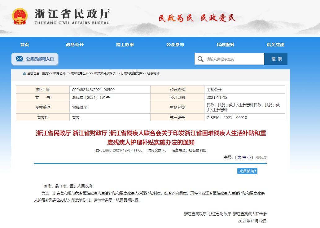 浙江省困难残疾人生活补贴和重度残疾人护理补贴实施办法
