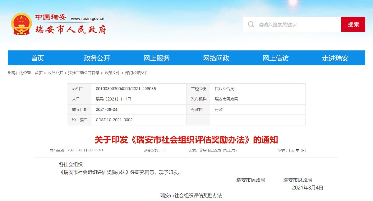 第一条 根据民政部《社会组织评估管理办法》(民政部令第39号)、省民政厅《浙江省社会组织评估工作规程》(浙民民﹝2014﹞142号)、《温州市民政局 温州市财政局 关于印发温州市社会组织评估奖励办法的通知》(温民社组〔2020〕93号)、《中共瑞安市委 瑞安市人民政府 关于加快推进新时代民政事业高质量发展的实施意见》(瑞委发〔2020〕22号)精神,为激发社会组织活力,促进社会组织健康有序发展,奖励并扶持参加社会组织评估且获得3A及以上等级的社会组织,结合我市实际,制定本办法。