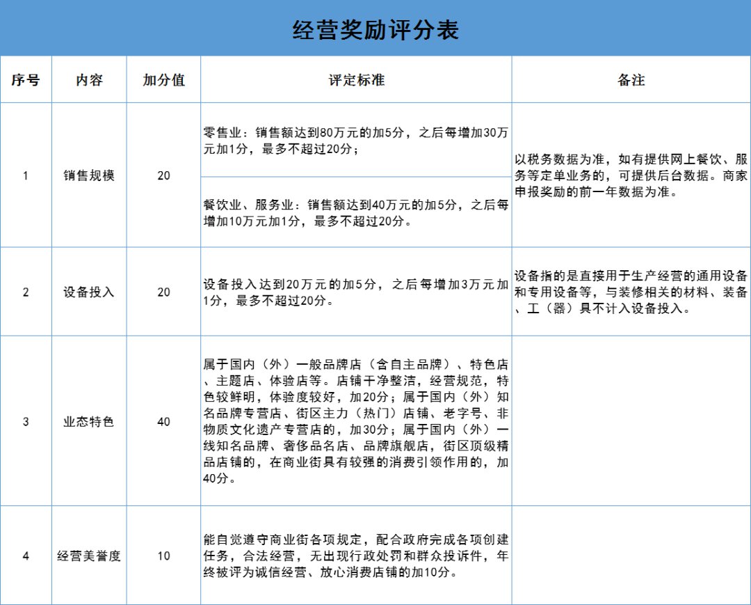 备注:经营奖励由苔湖商业街领导小组采用评审得分机制,入选的店铺在保底分的基础上获得加分,累计后确定奖补总金额。保底分为10分,加分项目分为销售规模、设备投入、业态特色、经营美誉度等四项内容,设置总分值90分,两项合计100分,领导小组根据表格的量化数值进行赋分。奖励金额上限为30万元,店铺将累计的分值,按每分3000元的补助标准进行折算后确定奖补金额。每家店铺只能享受一次经营奖励。