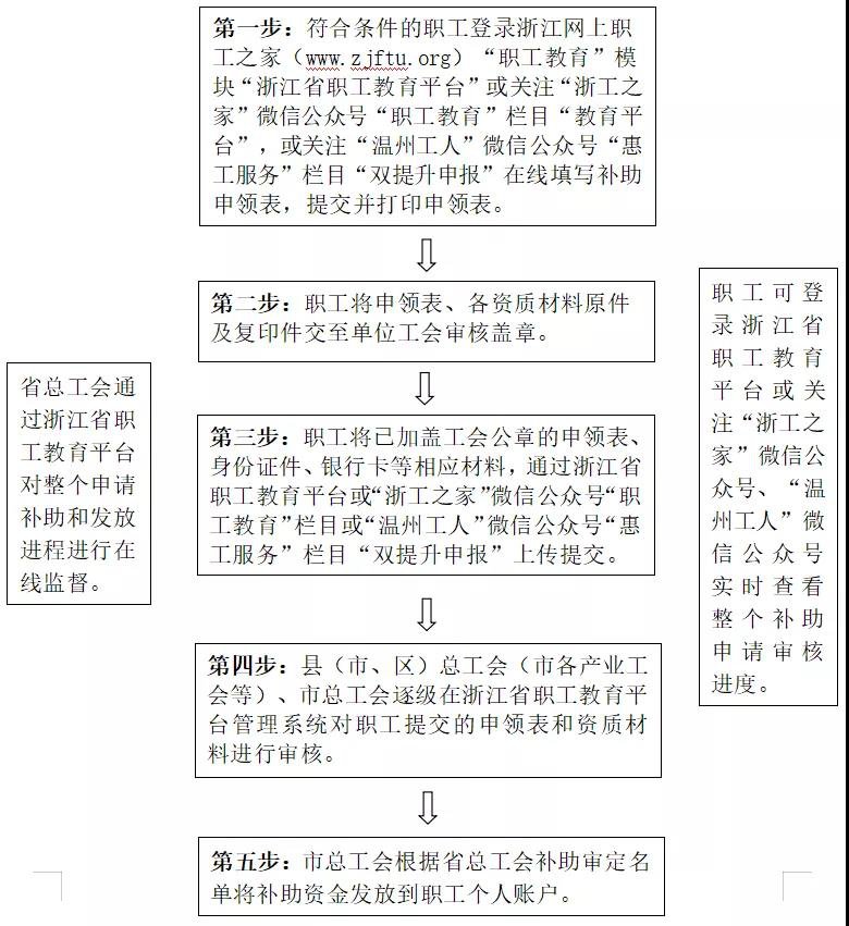 符合条件的职工在线填写补助申领表,打印后,携带相关资质材料原件及复印件,到所在单位工会审核盖章,再将盖章后的申领表、身份证件、证书(含封面、照片页、成绩页等)、证书查询在线验证凭证、银行卡等,通过平台或“浙工之家”微信公众号“教育平台”、“温州工人”微信公众号“惠工服务”栏目“双提升申报”上传提交,待各级工会审核。平台于8月5日上午10时开放申报,于9月25日上午10时关闭申报。