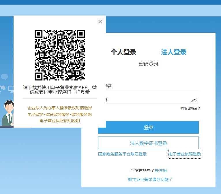 使用微信或支付宝手机端扫描登录页面的二维码,输入申领电子营业执照时设置的密码点击确认登录。
