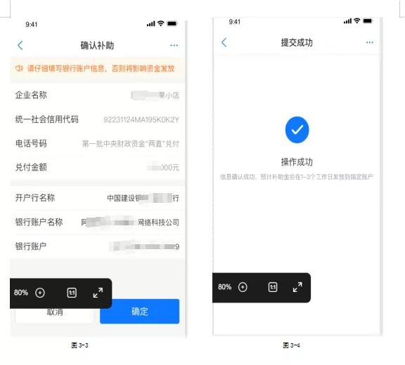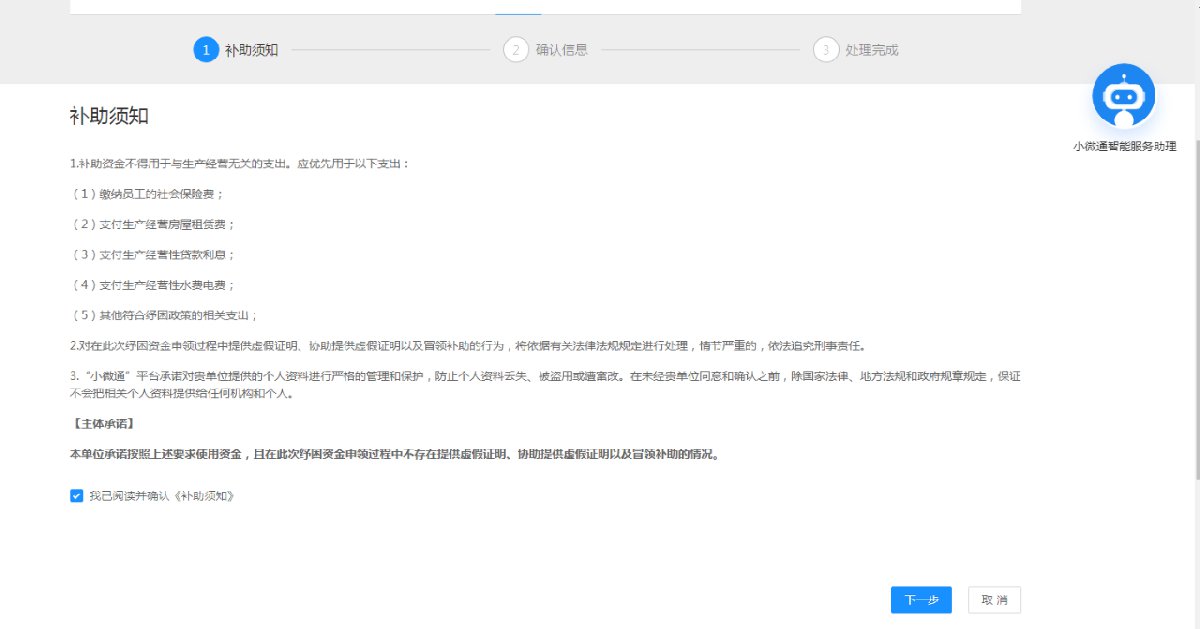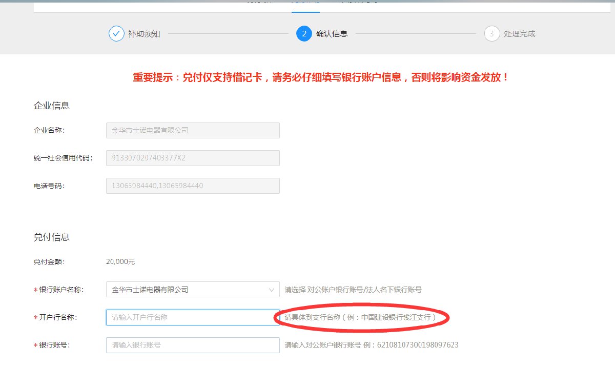 点击在线兑付后完成人脸识别,会进入兑付界面,勾选补助须知,浏览完之后进入下一步,核对企业信息,录入开户行名称、银行账户名称、银行账号等信息,核对完之后输入手机号码,点击确定按钮,即可操作完成。