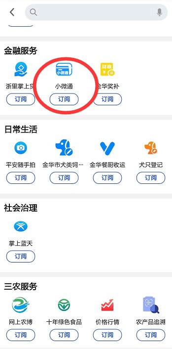 进入浙里办app首页,点击更多服务按钮,进入服务超市,下滑至金融服务,选择小微通,或者直接搜索“小微通”。