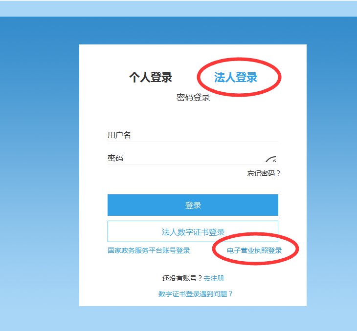 ①法人登录非法定代表人账户登录,而是使用企业法人账户登录。②浏览器因兼容性问题,暂不支持IE浏览器。建议使用谷歌浏览器,360浏览器极速模式、搜狗浏览器及QQ浏览器。