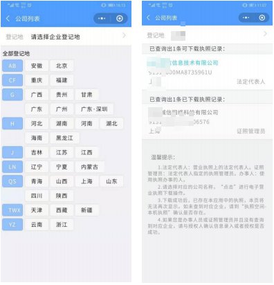 ●点击开始输数字—授权成功后选择登记地,浙江在最底部—到可下载执照列表页面—点击选择对应企业—点击下载,会提示下载成功等字眼