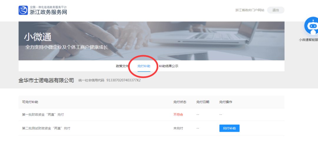 点击兑付补助页面。如果企业不符合,兑付状态列会显示不符合;反之点击兑付进入兑付流程界面,若已申请过兑付,则展示状态为兑付中。