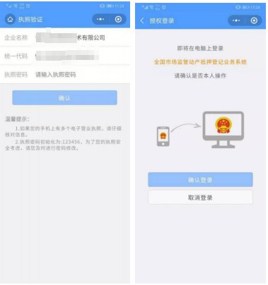 3、电子营业执照认证用户选择电子营业执照登录或进入兑付页面时,需进行电子营业执照认证。页面弹出二维码,使用支付宝、微信扫码(会自动跳转到电子营业执照小程序)。选择对应电子营业执照,输入密码,初始为123456,点击确认登录,提示移动端授权成功。
