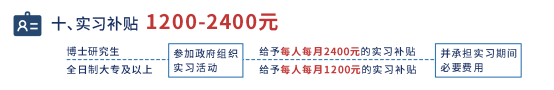 支持博士研究生、全日制大专及以上大学生来乐参加政府组织的实习基地实习活动,分别给予实习人员每人每月2400元、1200元的实习补贴,并承担实习期间必要的食宿、交通、通讯、考察、参观等费用,以及在乐期间综合商业保险费用。