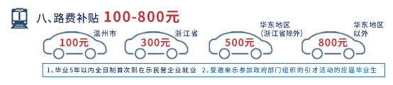 毕业5年以内全日制高校毕业生首次到乐民营企业就业的,按照出发地(生源地或毕业院校地)为温州市范围内、浙江省、华东地区(浙江省除外)、华东地区以外分别给予个人100元、300元、500元、800元的求职路费补贴。受邀来乐参加政府部门组织的引才活动的应届毕业生,经认定,按同等标准享受求职路费补贴。