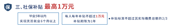 毕业5年以内的高校毕业生在乐通过从事个人创业、互联网营销等新业态职业实现灵活就业,并依法缴纳灵活就业社会保险费6个月以上的,给予社会保险补贴。补贴标准不超过其实际缴费总额的2/3,每人每年补贴不超过1万元,补贴期限为1年。