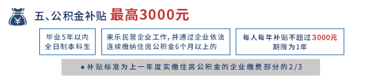 毕业5年以内的全日制本科生来乐民营企业工作,并通过企业依法连续缴纳社会保险费和住房公积金6个月以上的,给予企业公积金补贴。补贴标准为上一年度实缴住房公积金的企业缴费部分的2/3,每人每年补贴不超过3000元,期限为1年。