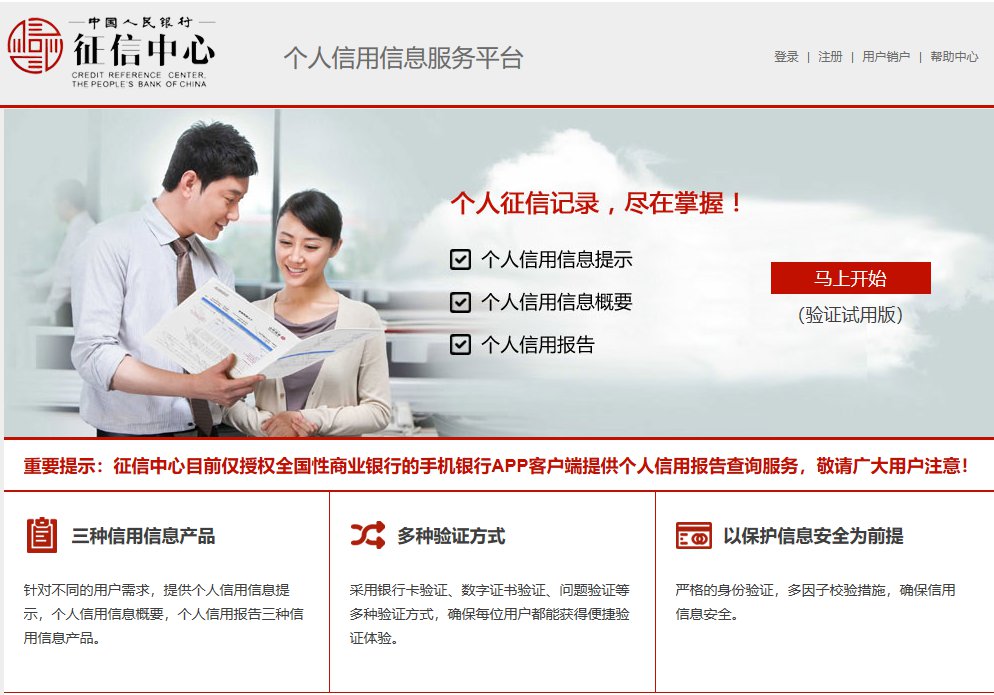 个人需要登录互联网个人信用信息服务平台进行注册。为保障信息安全,提交注册申请时需进行真实身份验证,通过验证方可成为注册用户。