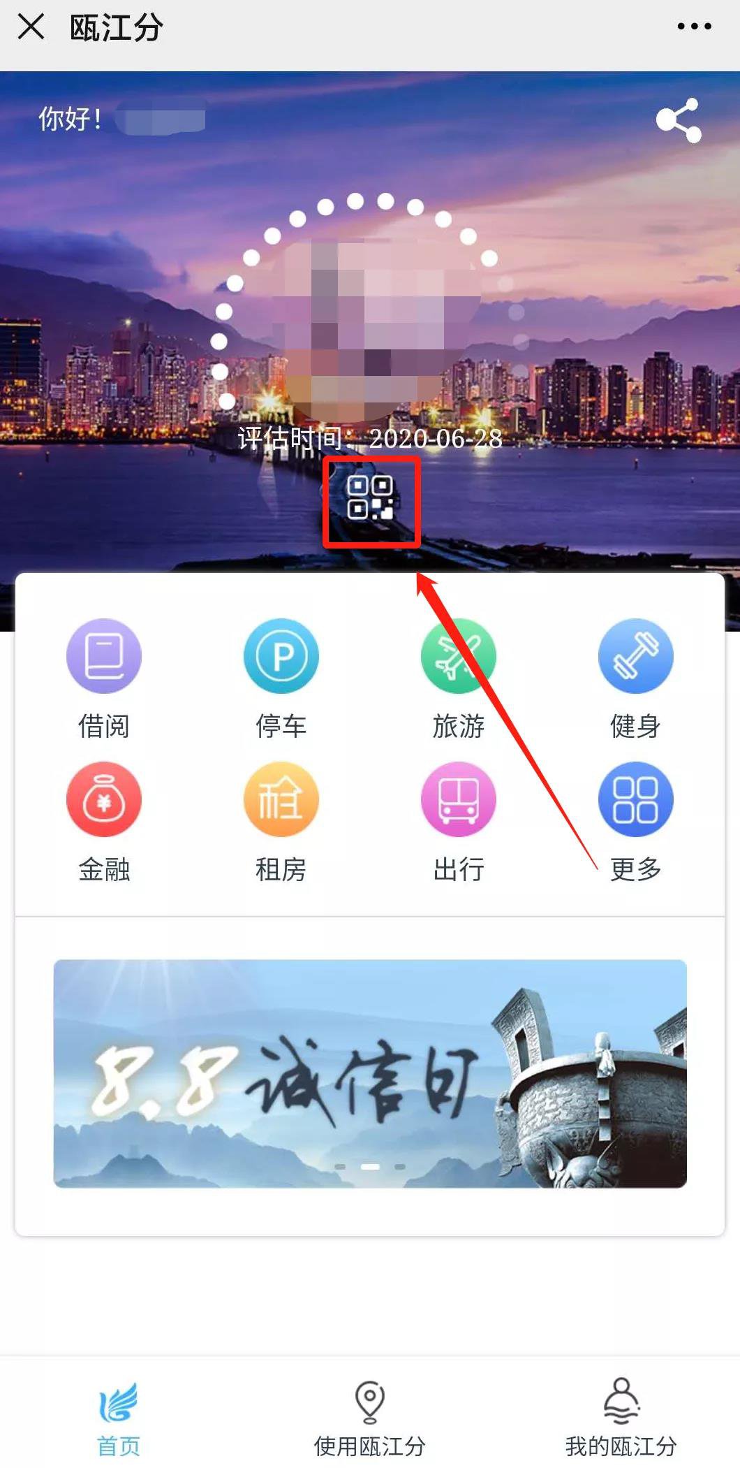 5、【登录账户】输入身份账号与密码登录后,在首页点击下图箭头所指按钮,即可显示“信用码”(目前仅试用)。