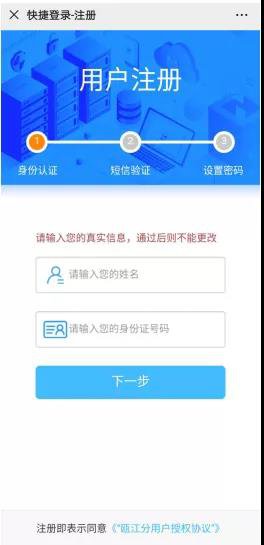 2、【身份认证】进入用户注册界面,如实输入个人姓名和身份证号码完成身份认证。