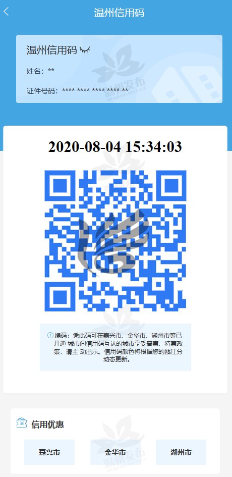 温州信用码设置三个等级,以“蓝、绿、黄”三色标识。蓝色为信用最高等级,绿、黄二色信用码代表的信用等级逐级降低。