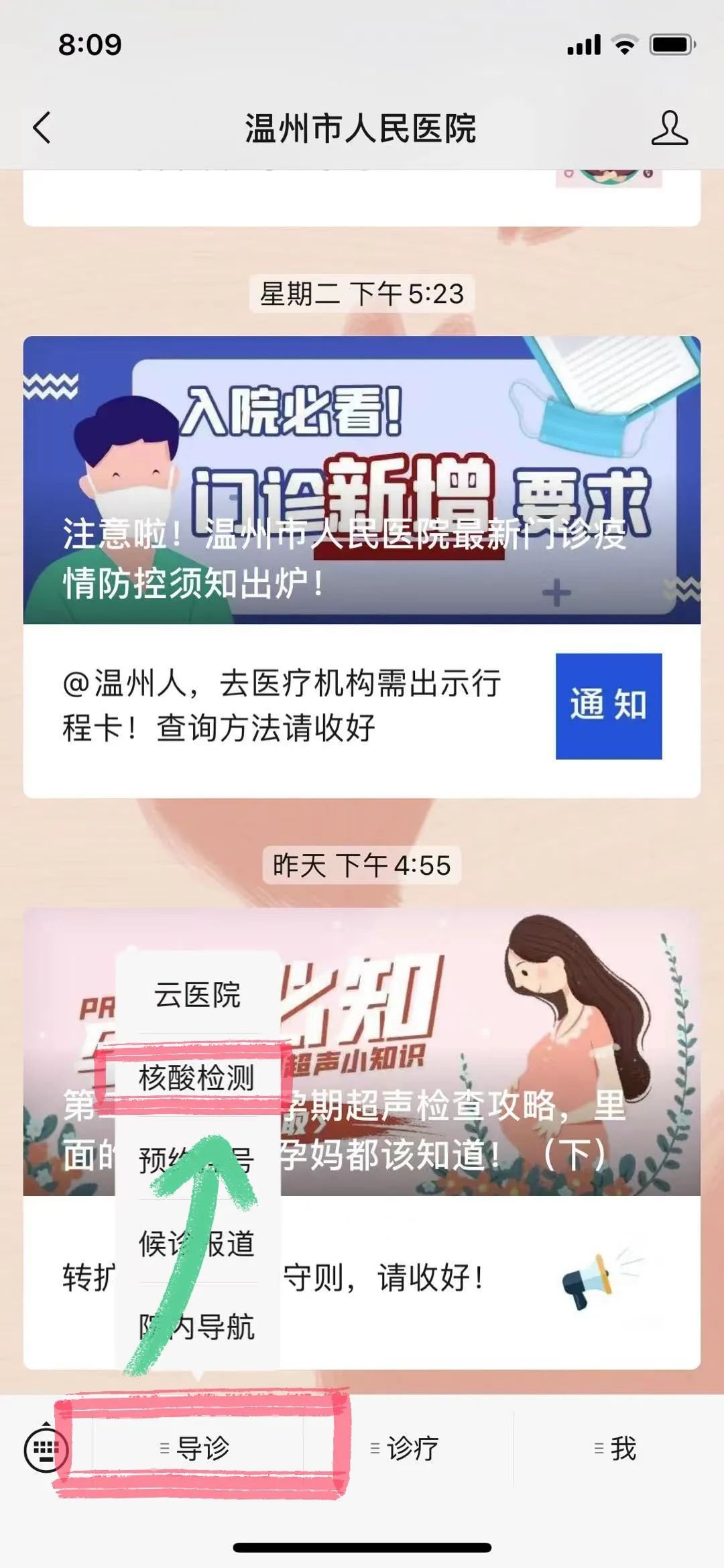 进入温州市人民医院公众号,点击菜单栏中【导诊】-【核酸检测】