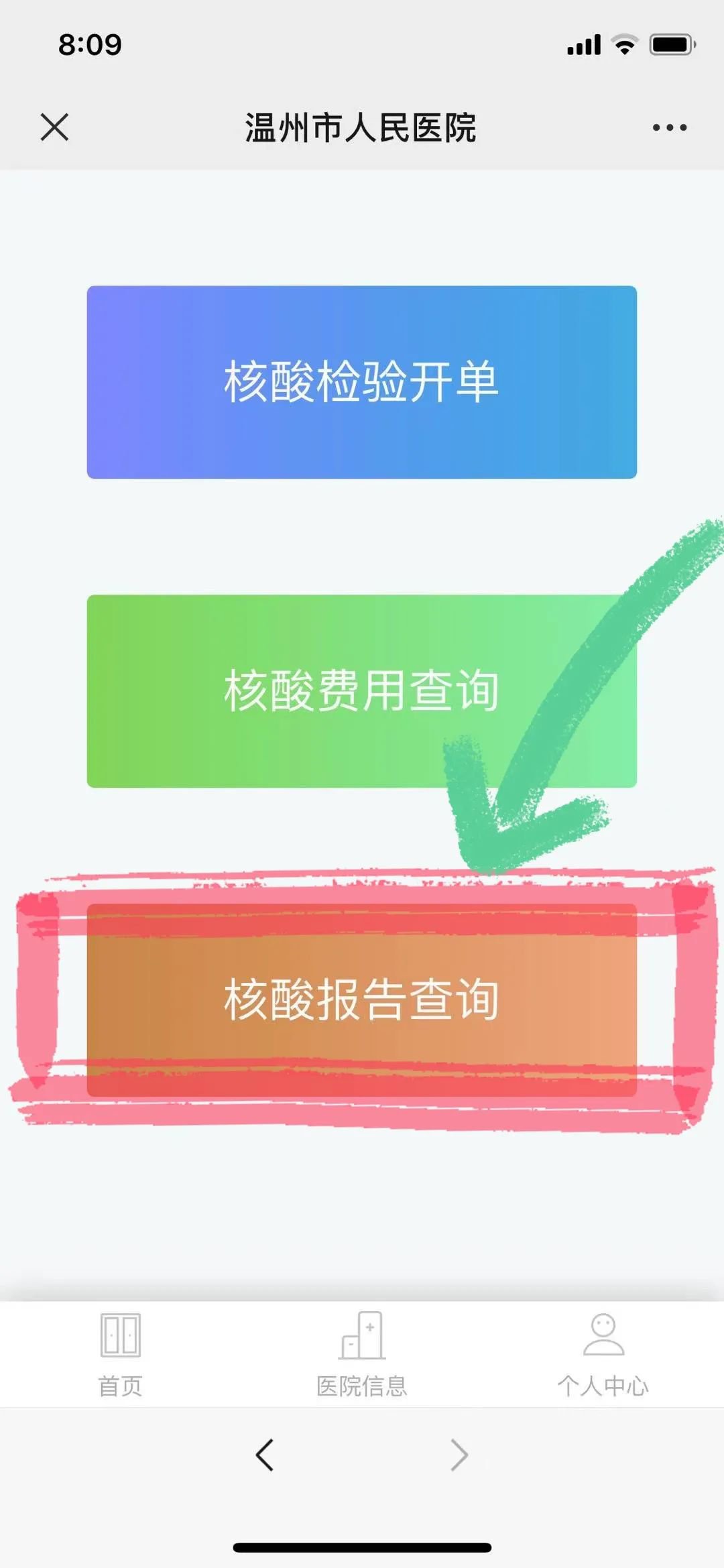 可登录“温州市人民医院”微信公众号,【导诊】—【核酸检测】—【核酸报告查询】自助查询核酸检测报告结果。