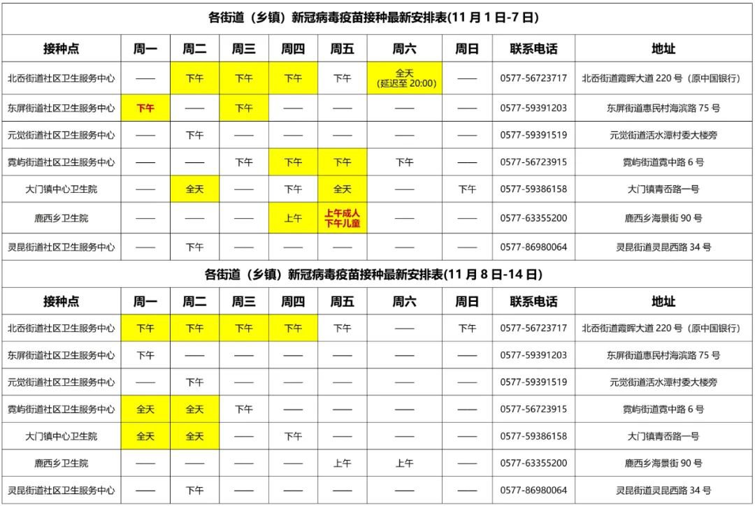 1.本表为安排计划表,其中标黄为学生专场,标黄红字为学生专场+成人固定开放日,如遇疫情等突发状况将略作微调,实际以各接种点公布时间为准,详询各接种点联系电话;