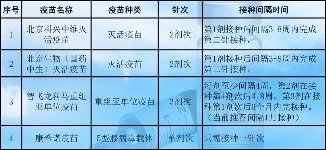 当前,我县新冠病毒疫苗供应主要有3个种类、4个厂家,详见下表: