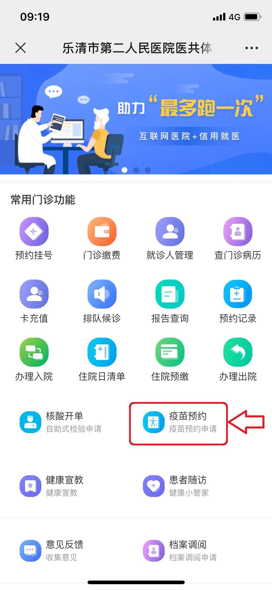 通过“乐清市第二人民医院医共体”在院内服务,疫苗预约专栏里进行预约。
