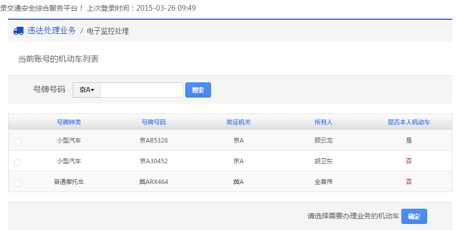 在该步骤,选择需要处理电子监控的机动车,界面如下图所示: