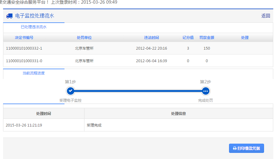 4、 缴款罚款在线支付成功后电子监控才算处理成功。