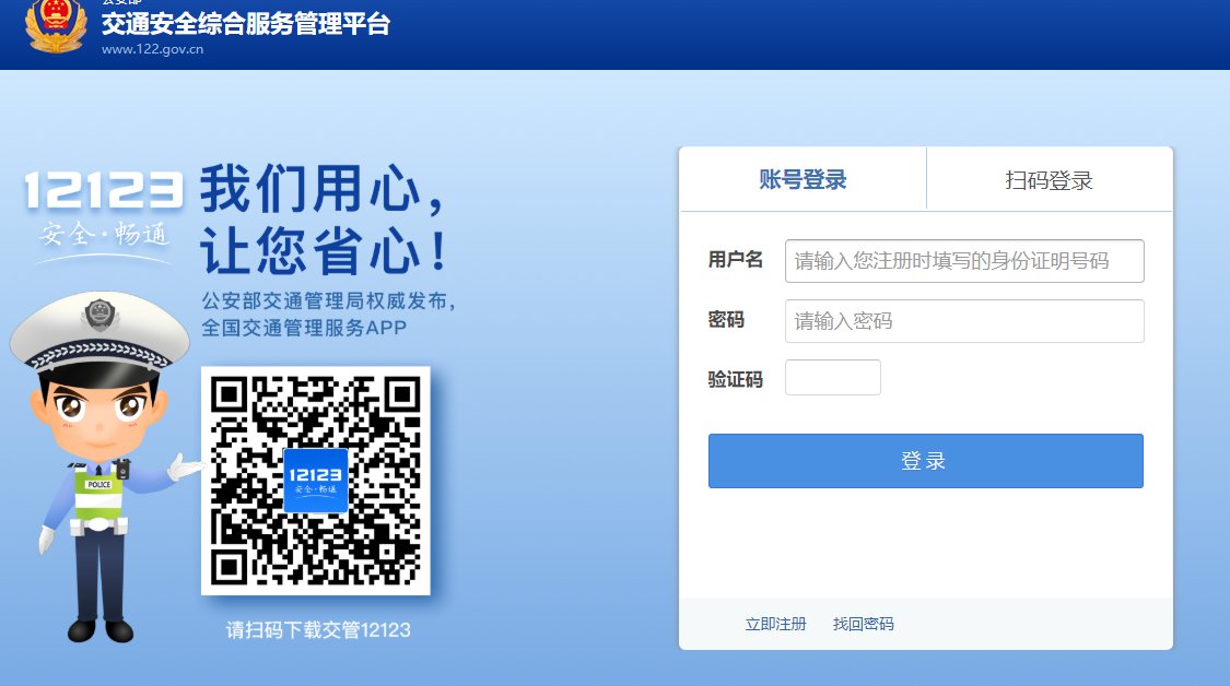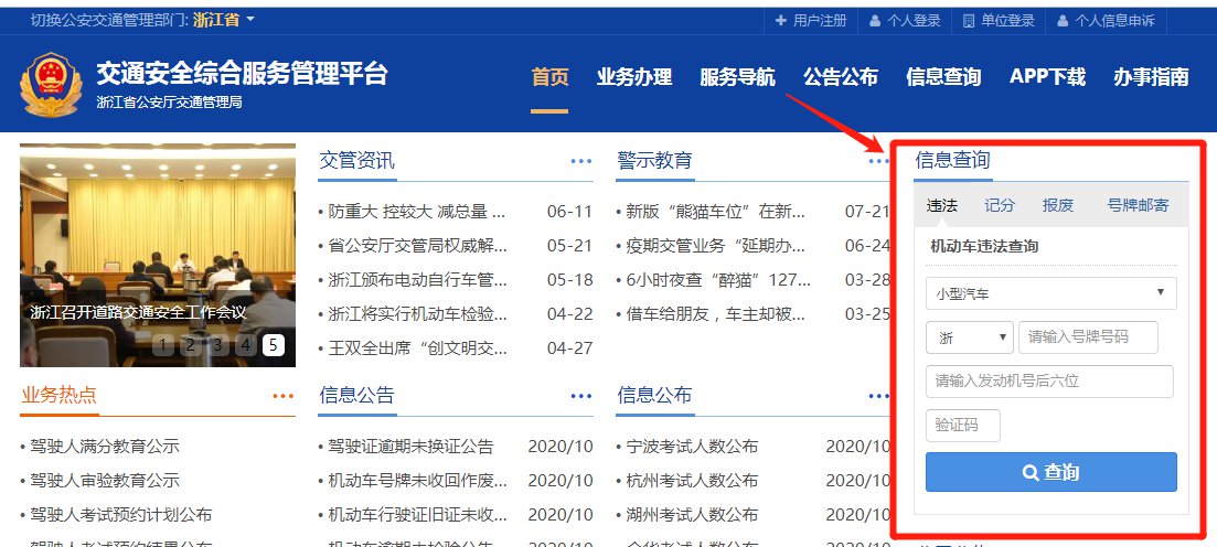 进入交通安全服务管理平台(https://zj.122.gov.cn/#/index),右侧输入车辆的信息,然后根据系统提示完成查询