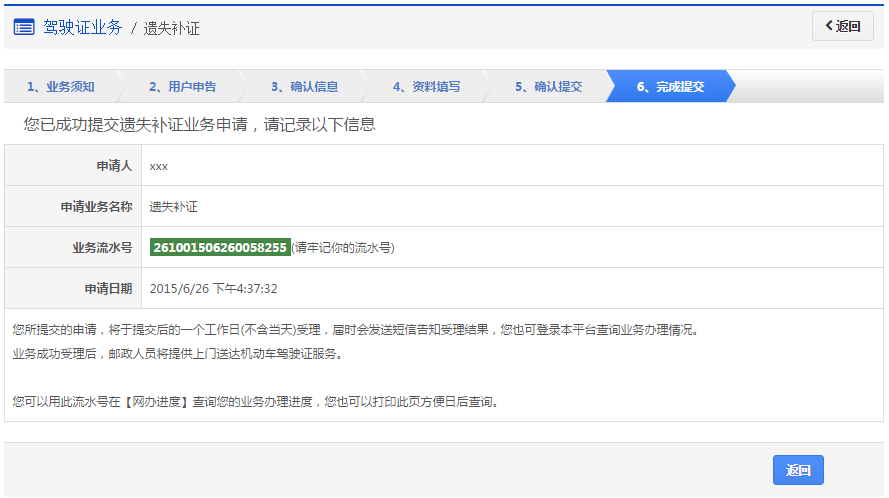 该步骤提交成功后,系统生成业务流水号。该步骤提交成功后,系统将于提交后的一个工作日(不含当天)受理(选择在线支付的业务费用支付完成后受理),届时会发送短信告知受理结果。用户可以根据该业务流水号在网办进度中查询业务办理进度。